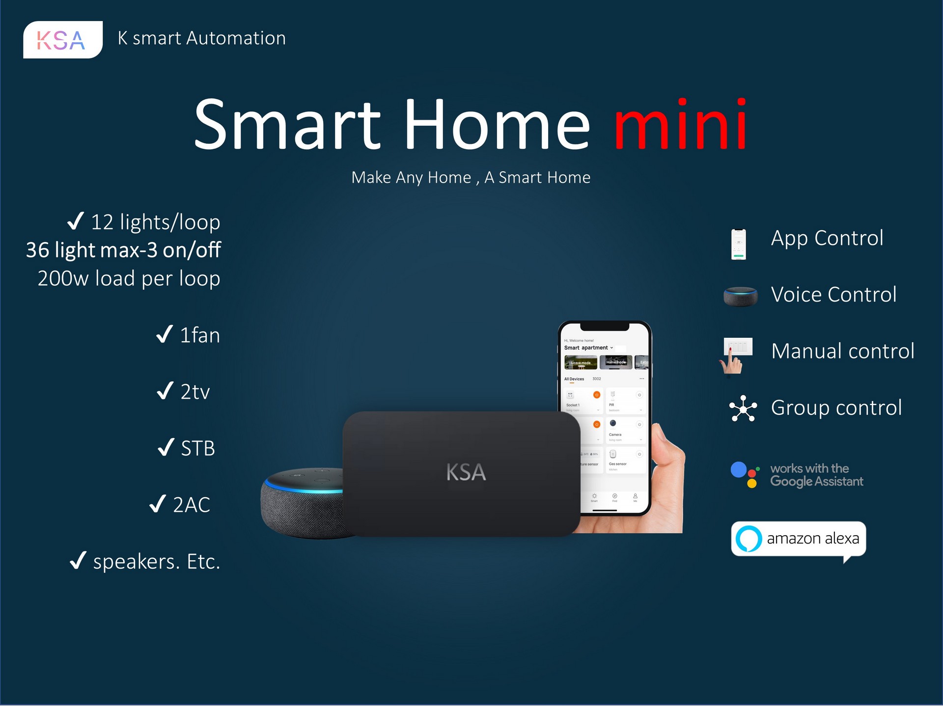 Simply connect KSA smart devices and transform your house into a remarkably smart, convenient and entertaining home. Control lights, fans, tv, loud speakers and AC etc. with your Phone or just with your voice.Place any KSA devices,in room, control from anywhere. And elevate your mood with automation scene. All with the security and privacy of KSA.