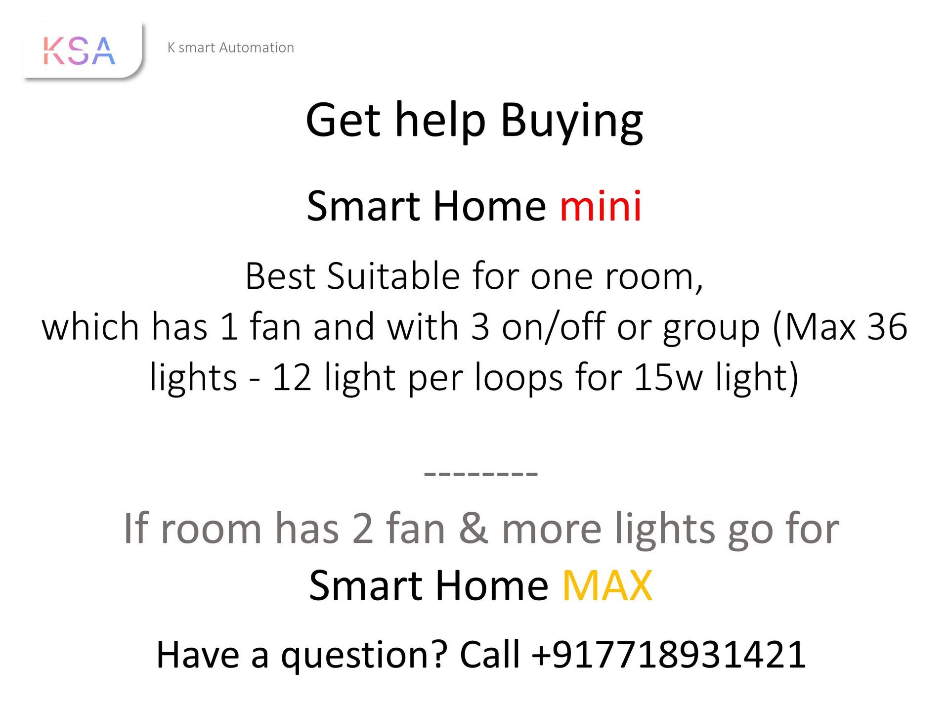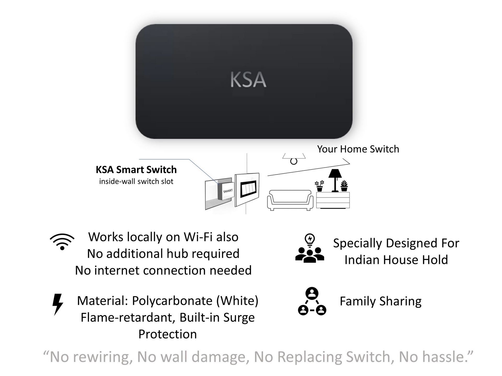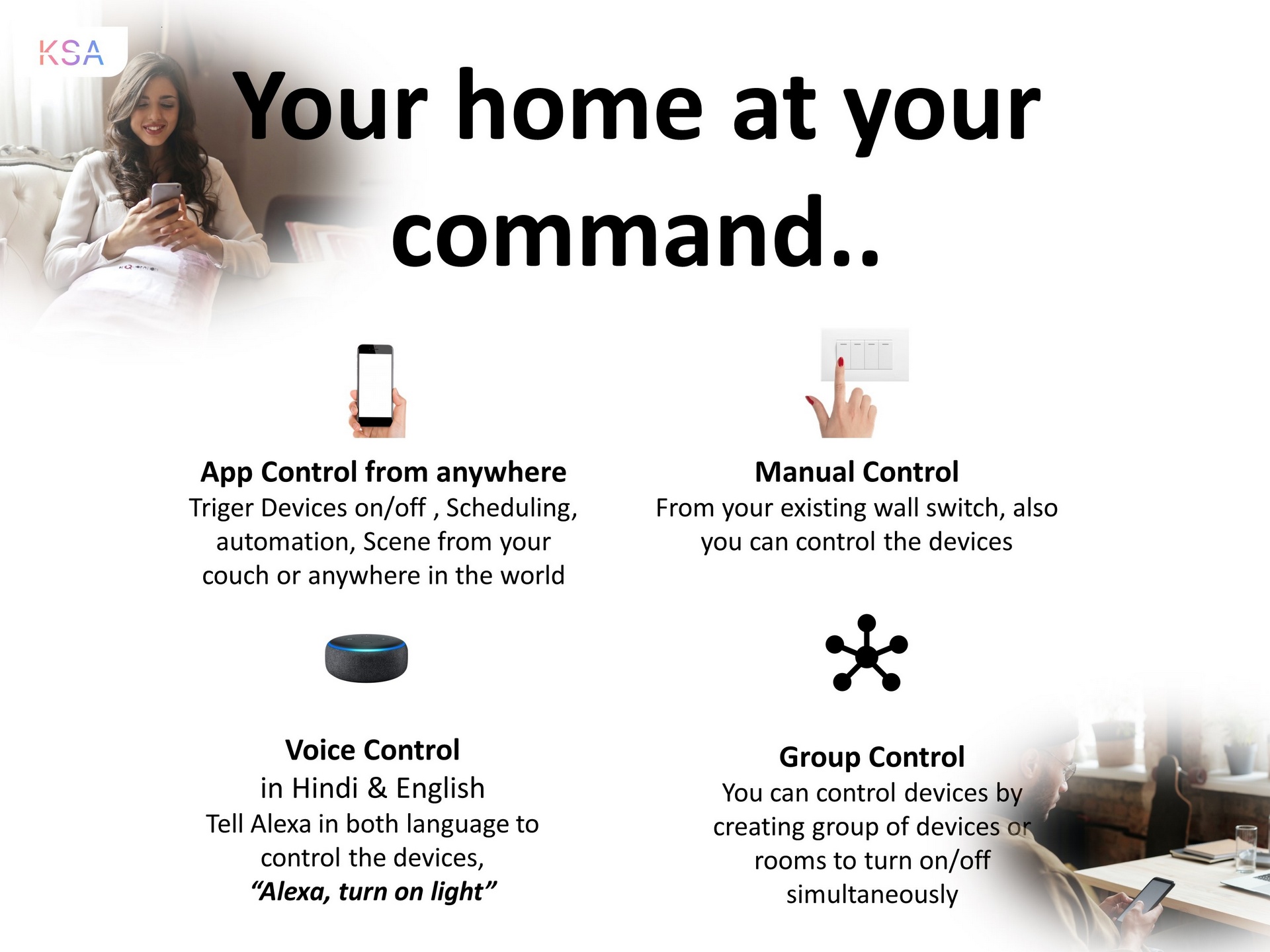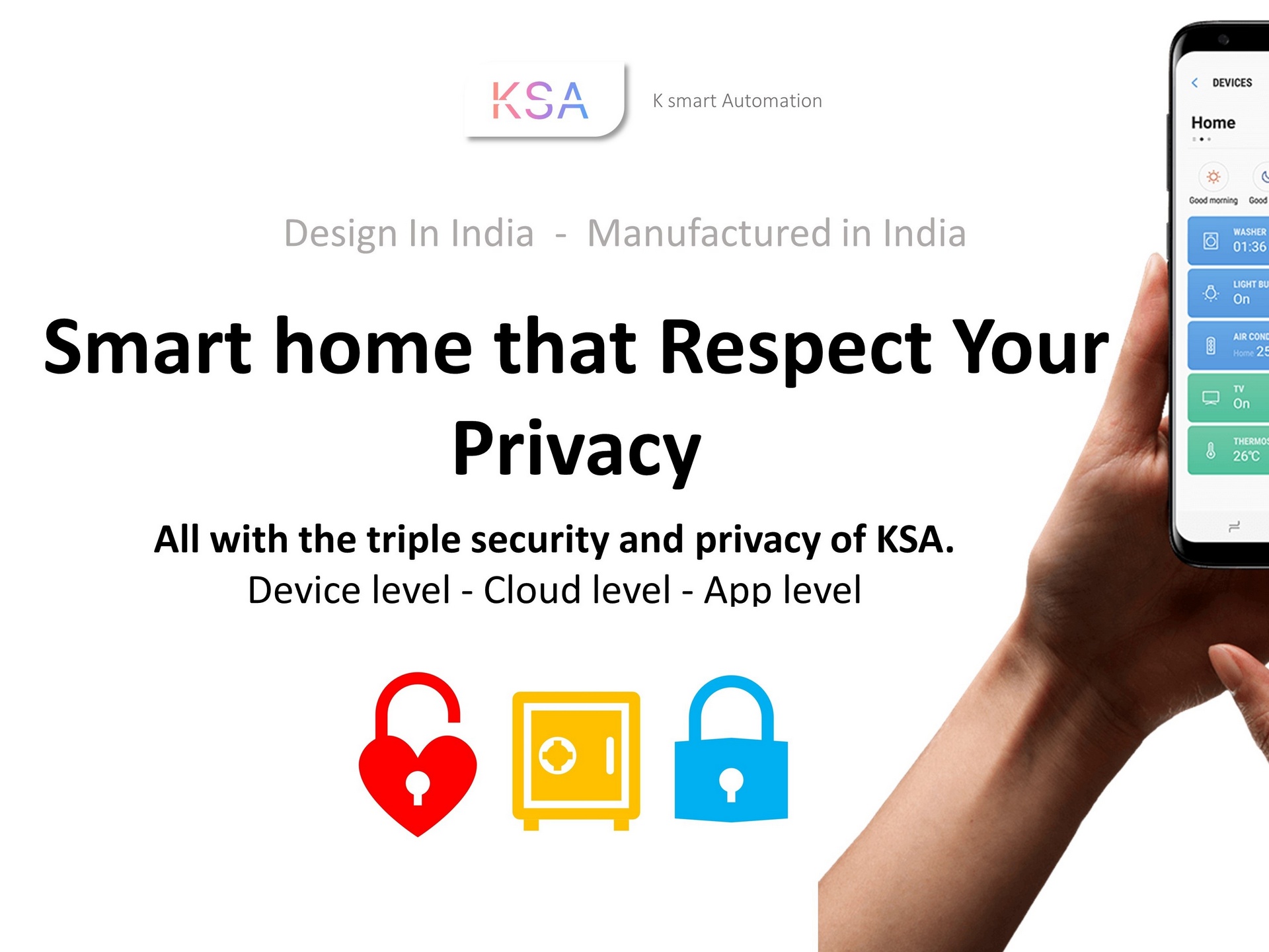 Simply connect KSA smart devices and transform your house into a remarkably smart, convenient and entertaining home. Control lights, fans, tv, loud speakers and AC etc. with your Phone or just with your voice.Place any KSA devices,in room, control from anywhere. And elevate your mood with automation scene. All with the security and privacy of KSA.